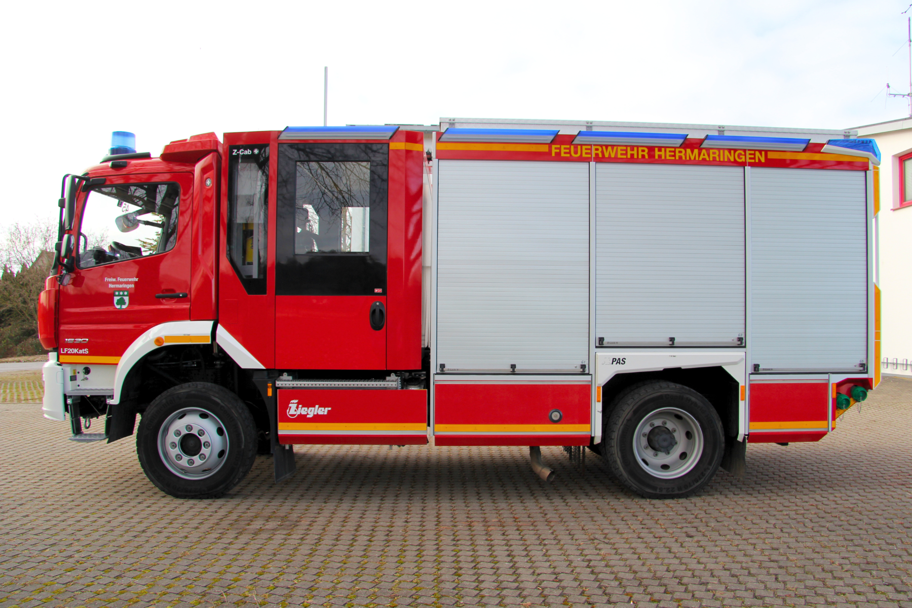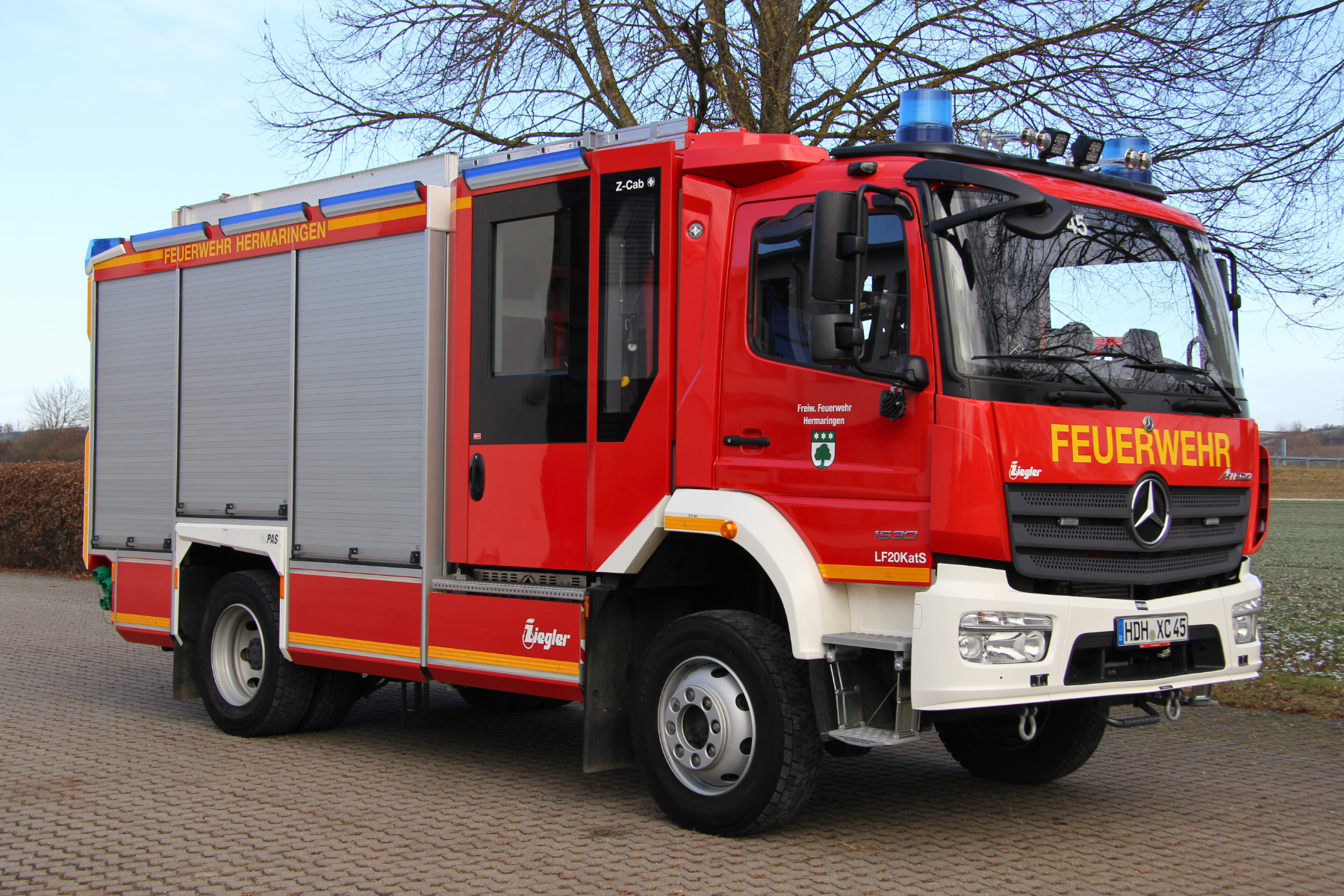 Das LF 20 KatS ist ein modernes Einsatzfahrzeug der Feuerwehr Hermaringen, konzipiert für Brandbekämpfung und Katastrophenschutzeinsätze. Es basiert auf einem Mercedes-Benz Atego 1530 Allradfahrgestell und wurde von der Firma Ziegler mit dem robusten ALPAS-Aufbau sowie der modernen Z-Cab Mannschaftskabine ausgestattet. Diese bietet dank des integrierten Sicherheitssystems Z-Protect optimalen Schutz für die Einsatzkräfte.